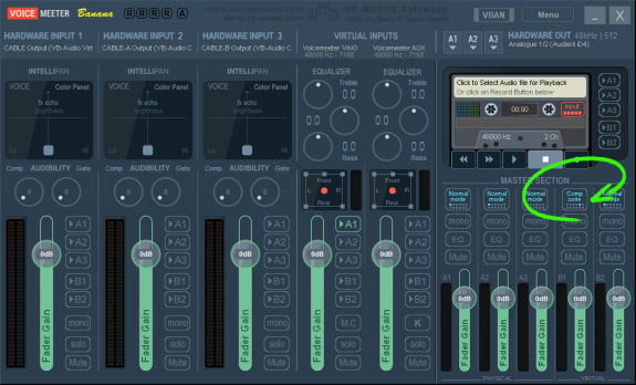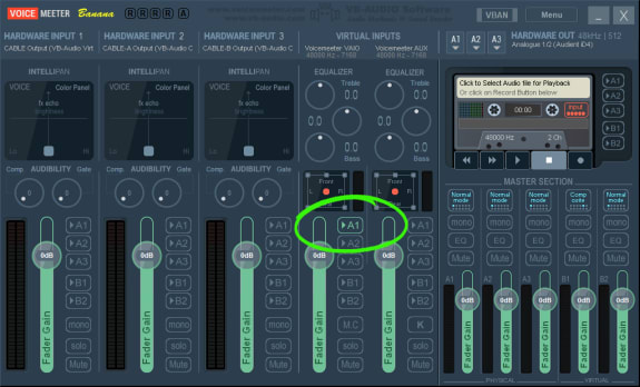 Next, decide which of Voicemeeter’s virtual interfaces you want to use to carry all tracks. In this tutorial, I’ll go with the “Voicemeeter VAIO” interface (or “B1” for that matter). Send this interface’s output to your main hardware output by activating the “A1” routing as shown in the following screenshot: